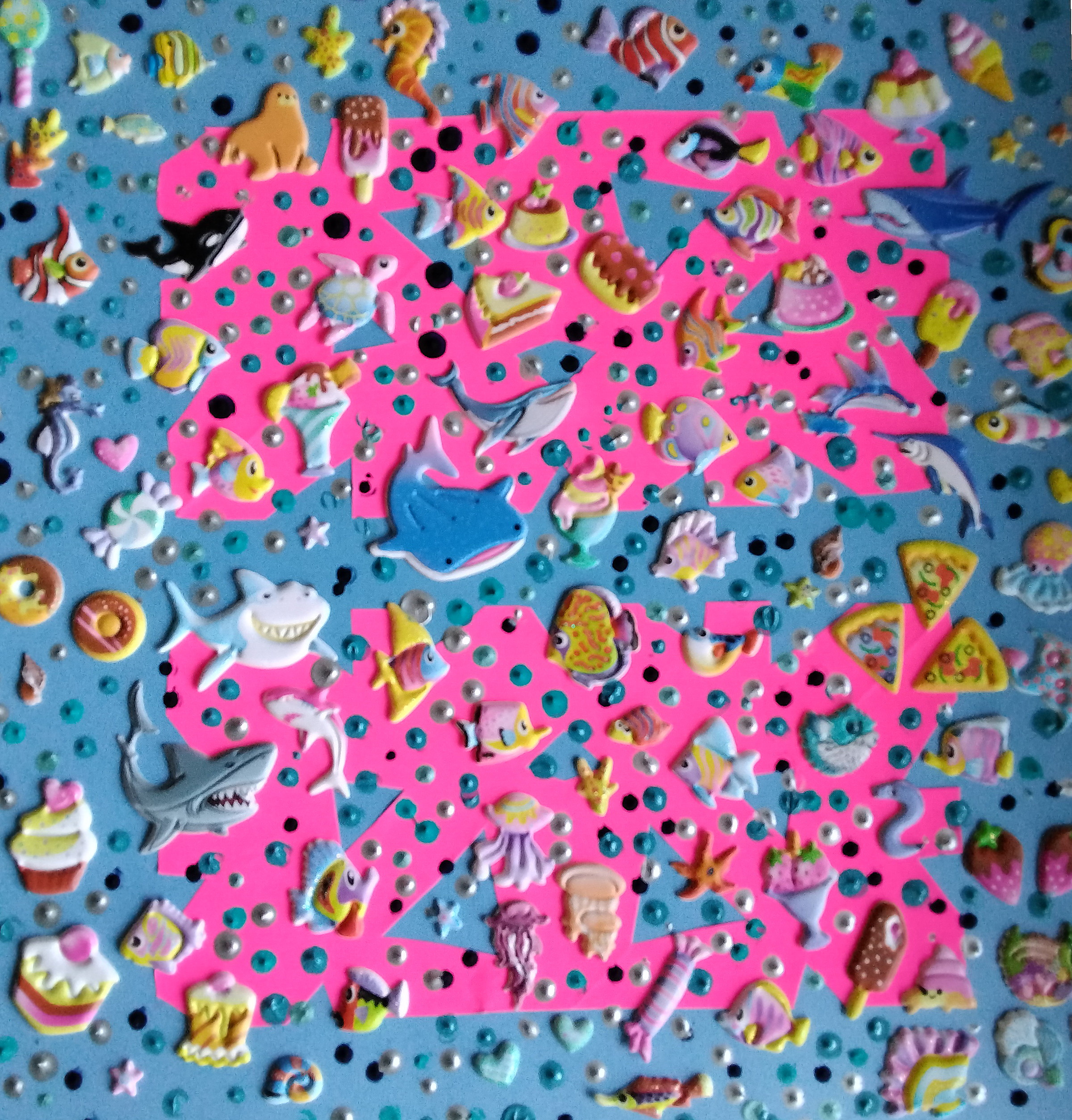 Medium: Oil pastels, stickers and acrylic paint on recycled paper